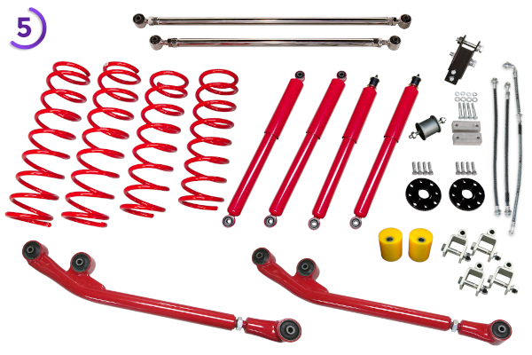5インチアップコイルにラテラルアップ補正ブラケットやプロペラシャフトスペーサーなどを含んだキット。大径タイヤの干渉対策のために調整式リーディングアームを付属しています。