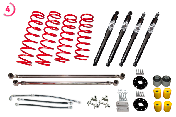 4インチアップコイルとモンローロードマチックショックに加えて、各部の補正ブッシュや延長ブロックなど含むキット。純正アームのままでコスト重視の方におすすめ。